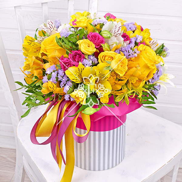роза желтая – 5 шт., роза желтая кустовая – 4 шт., роза розовая (малиновая) кустовая – 3 шт., альстромерия белая и желтая – 8 шт., статица светло-фиолетовая (фиолетовая), зелень декоративная (фисташка), оазис, коробка, лента.